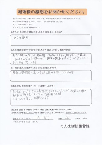 膝の痛みでお悩みの患者さん(S.Kさん・50歳女性)より、このようなお声をいただきました。